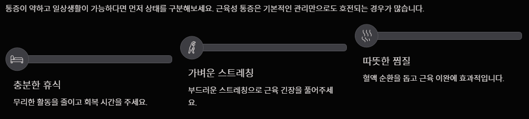 → 이런 방법으로 증상이 완화되는지 먼저 확인해보세요. 대부분의 근육성 통증은 이런 기본적인 관리만으로도 충분히 좋아지는